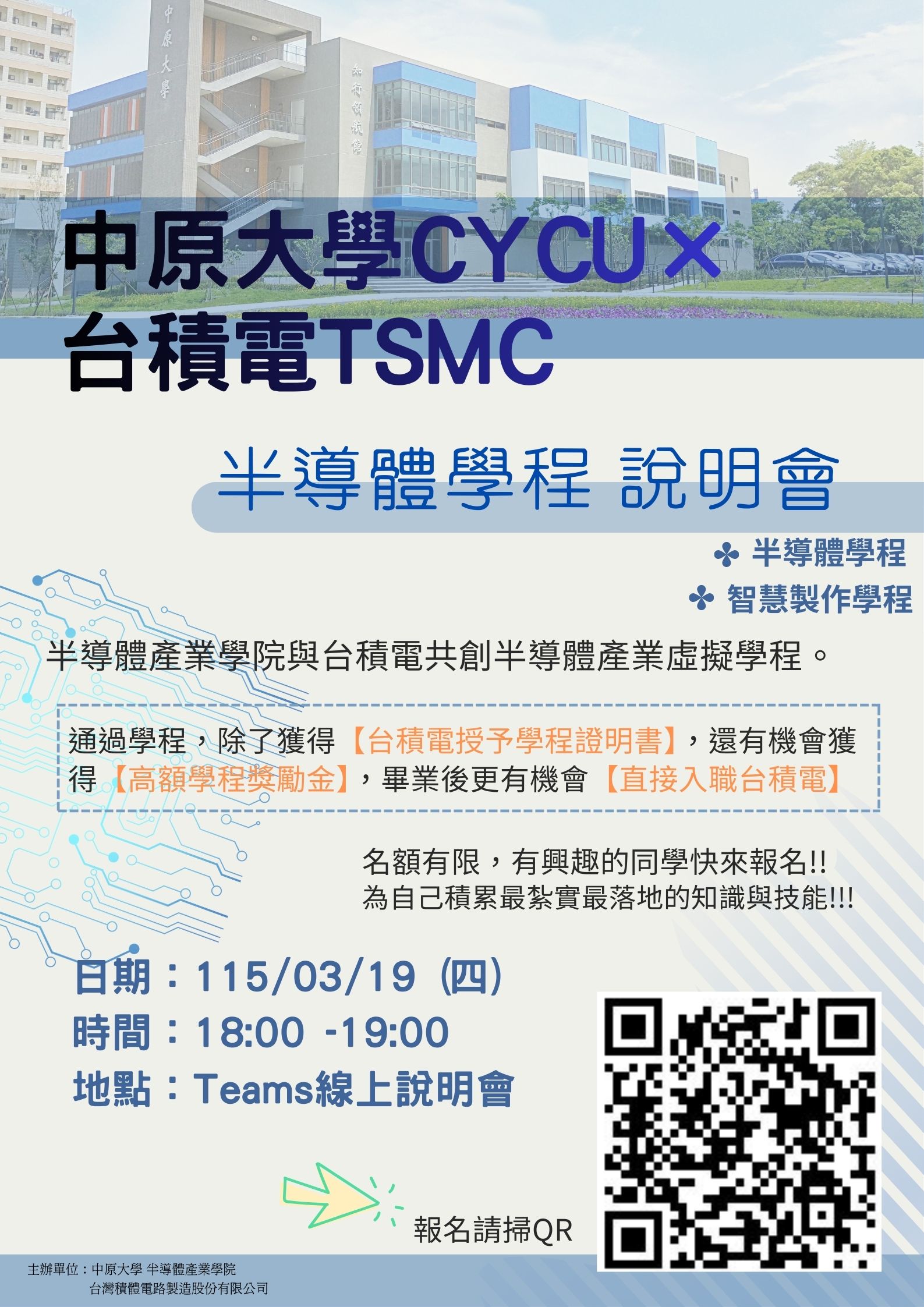 【台積電學程說明會03/19】114-2中原大學CYCU×台積電TSMC 半導體學程說明會,即日起開始報名!!