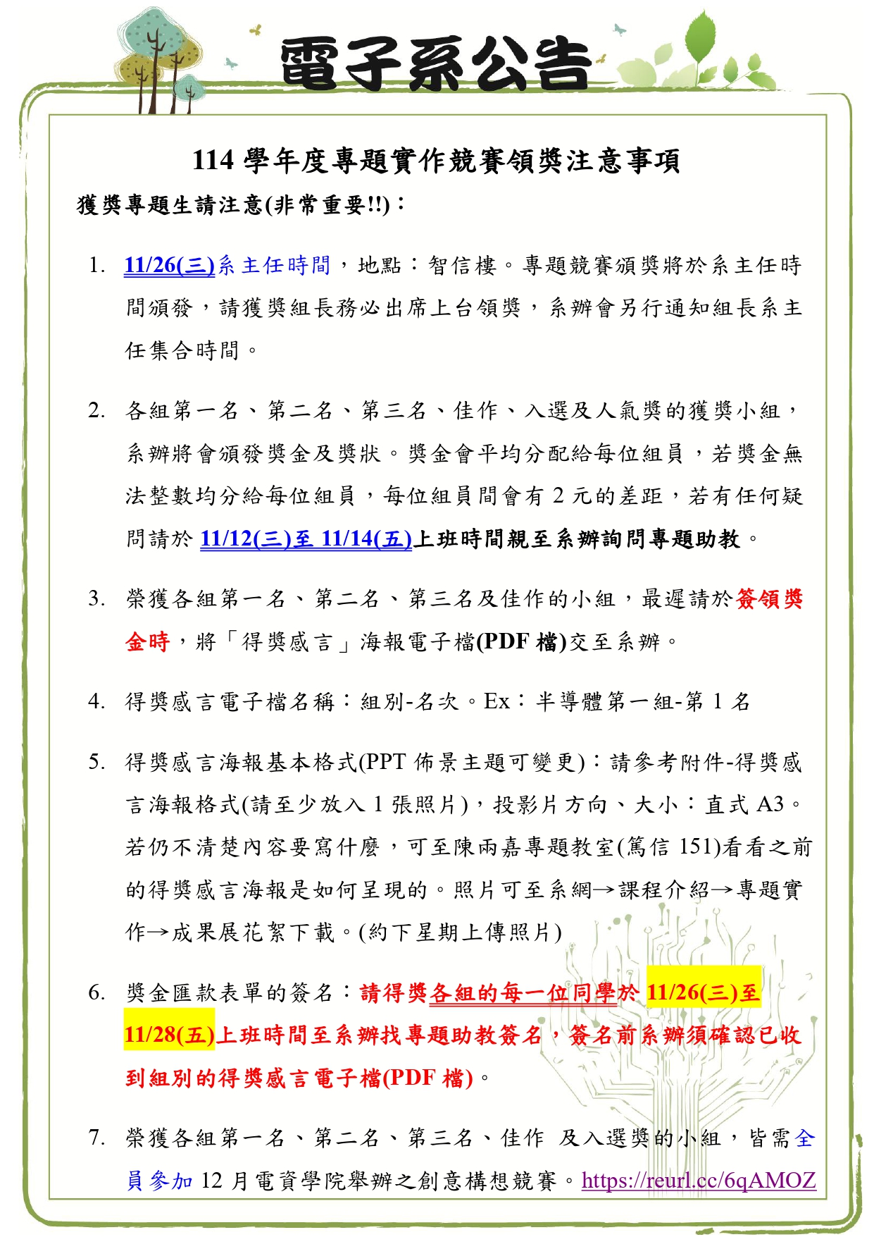 114學年度專題實作競賽得獎名冊及領獎注意事項