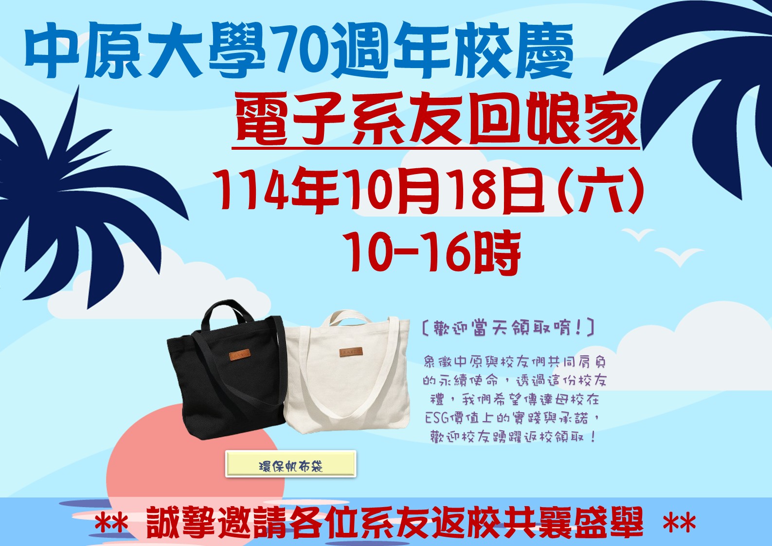 114年10月18日校友日-電子系友回娘家活動說明,誠摯地邀請您回娘家領取精美校友紀念禮品!!