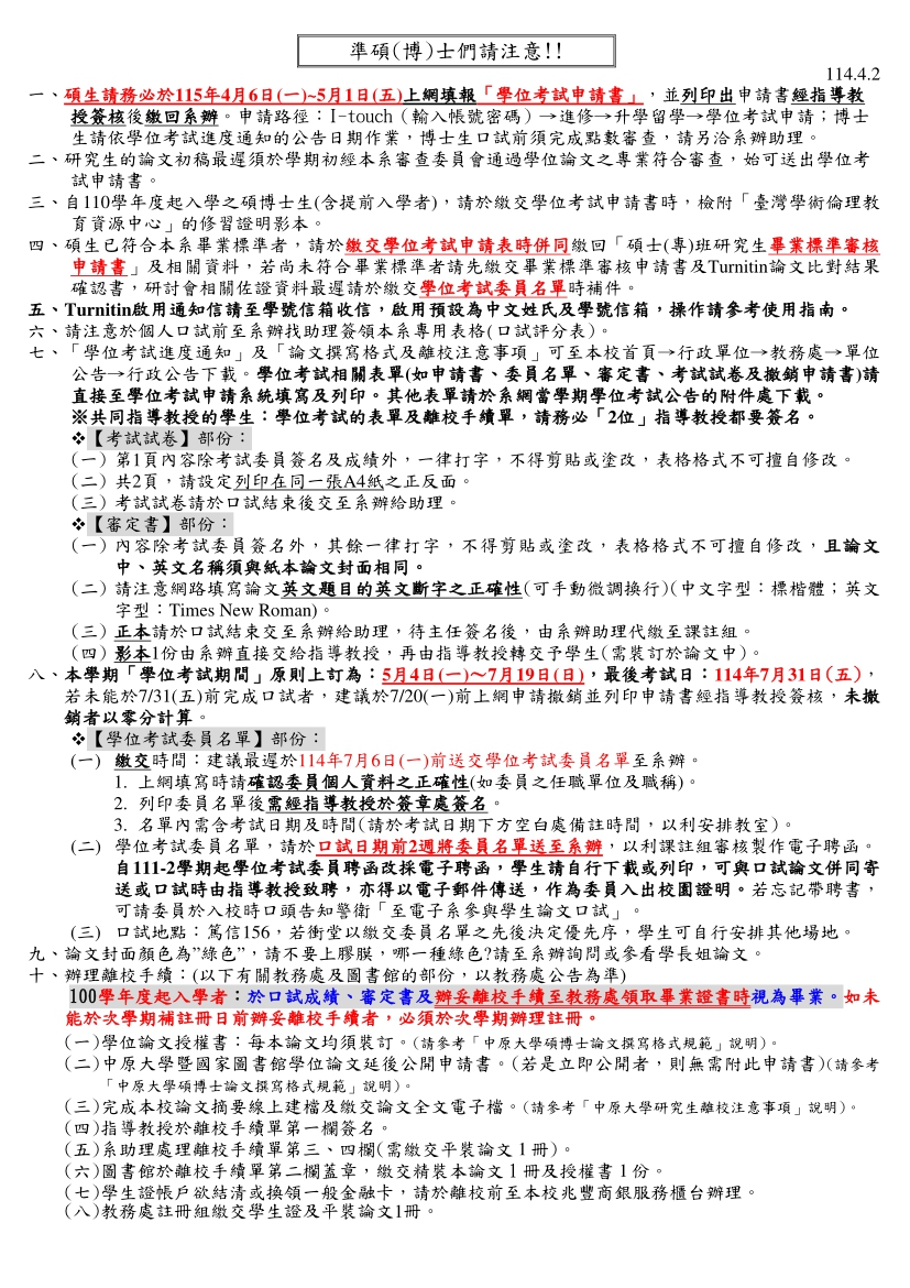 114-2學期研究生畢業須知、學位考試進度通知、論文撰寫格式及離校注意事項相關公告